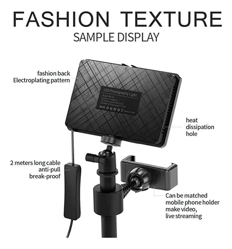 Kit de iluminación LED ideal para fotografía, maquillaje, streaming, videollamadas, grabación de contenido y transmisiones en vivo. Incluye dos luces LED de 70 diodos cada una, soportes ajustables de aluminio y accesorios adicionales para lograr una iluminación profesional en cualquier espacio.