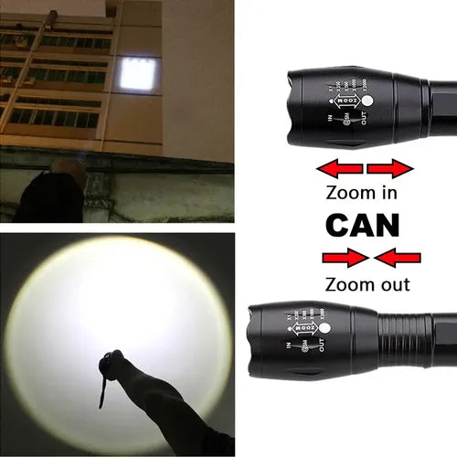 Esta linterna militar táctica es retráctil con zoom y alta potencia, ideal para camping, bicicleta, salidas, garajes o cualquier actividad al aire libre. Su ahorro de energía y batería de larga duración referencia 18650 (incluida) la hacen una opción práctica y eficiente.