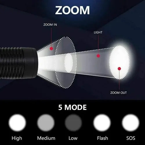 La linterna ofrece 15000 lúmenes equivalentes, cinco modos de iluminación y un sistema de zoom ajustable. Incluye 4 baterías 18650 (2 de uso + 2 de repuesto), cargador de pared y estuche rígido resistente a golpes.